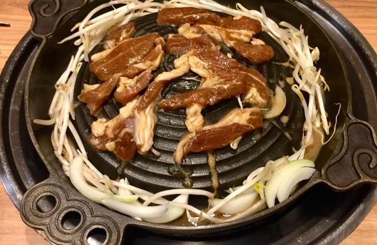 From the pictures above, you can see that the grill is dome-shaped with the vegetables (bean sprouts and onions) on the bottom edges and the meat goes on dome. The juices from the meat and the sauce, if you choose marinated jingisukan, will drip down and help with cooking the vegetables.